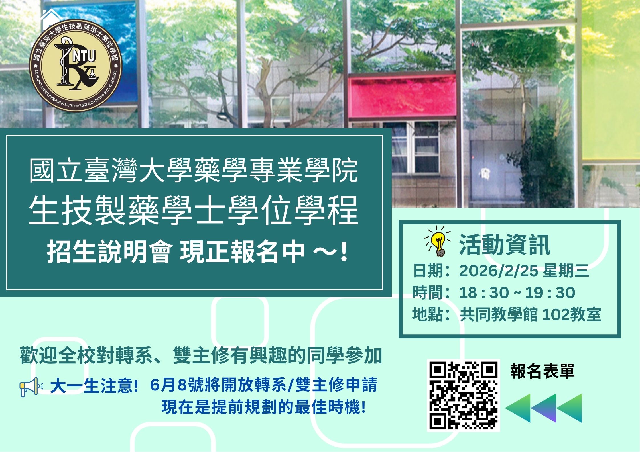 臺大醫學院生技製藥學士學位學程誠徵助理教授級以上專案教師(116年2月1日起聘) 一、 應徵資格: ...