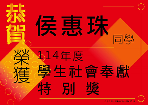 【恭賀】侯惠珠同學榮獲114年度學生社會奉獻特別獎