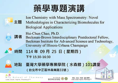 【藥學專題演講】Ion Chemistry with Mass Spectrometry: Novel Methodologies in Characterizing Biomolecules for Biological Applications|Hsi-Chun Chao, Ph.D.