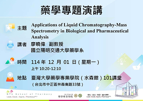 【藥學專題演講】Applications of Liquid Chromatography-Mass Spectrometry in Biological and Pharmaceutical Analysis|廖曉偉 副教授/國立陽明交通大學 藥學系