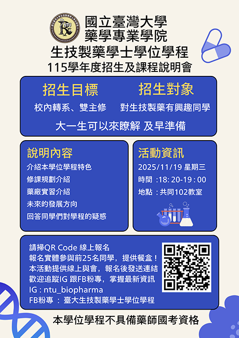 國立臺灣大學藥學專業學院新設立「生技製藥學士學位學程」