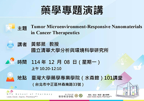 【藥學專題演講】Tumor Microenvironment-Responsive Nanomaterials in Cancer Therapeutics|黃郁棻 教授/國立清華大學 分析與環境科學研究所