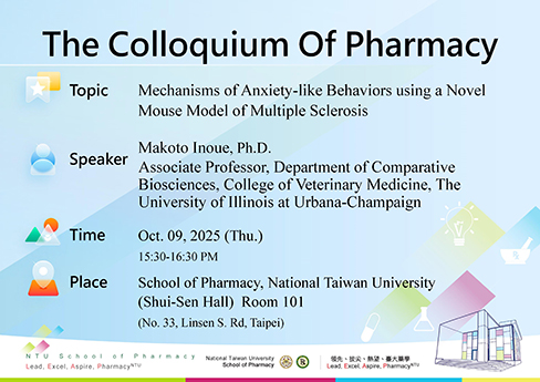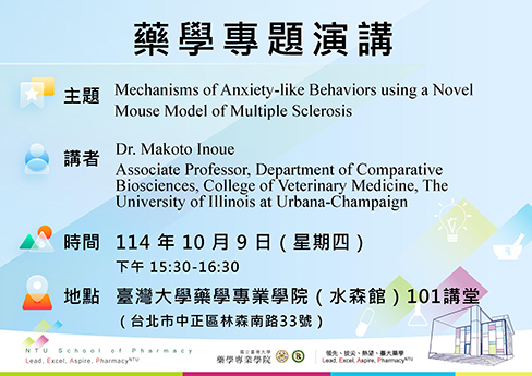 【藥學專題演講】Mechanisms of Anxiety-like Behaviors using a Novel Mouse Model of Multiple Sclerosis|Dr. Makoto Inoue