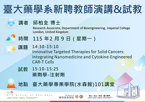 【演講通知】藥學系新聘教師演講與試教(2/9 14:30-15:30,水森101室)