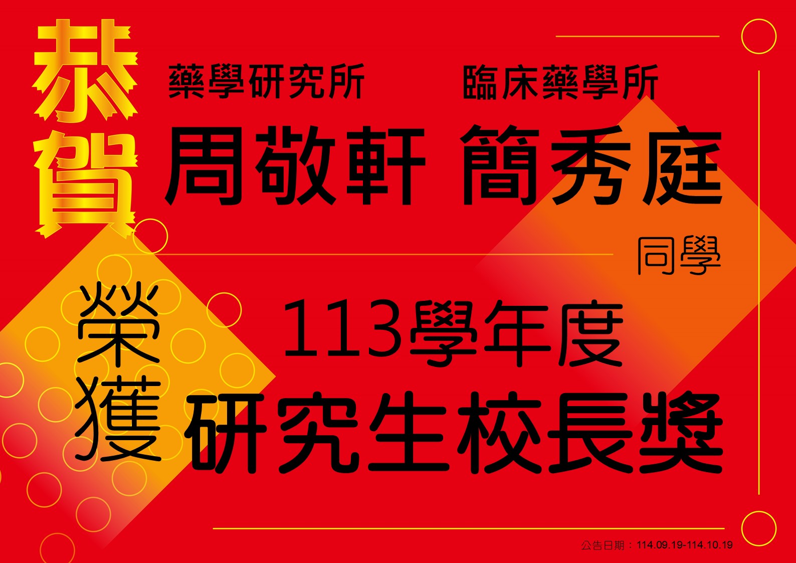 【恭賀】周敬軒、簡秀庭同學榮獲113學年度研究生校長獎
