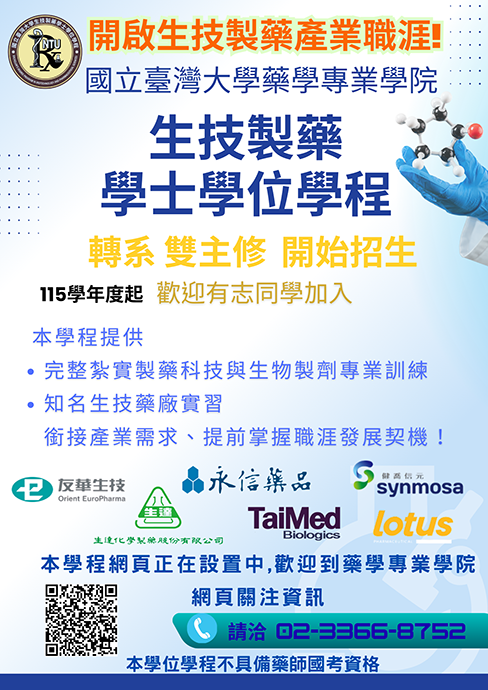 國立臺灣大學藥學專業學院新設立「生技製藥學士學位學程」