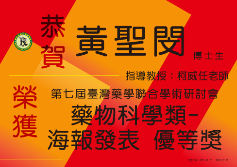 【恭賀】陳黃聖閔博士生獲第七屆臺灣藥學聯合學術研討會藥物科學類-海報發表 優等獎(指導教授:柯威任)