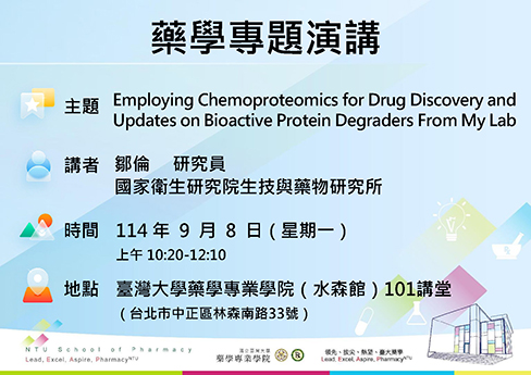 【藥學專題演講】Employing Chemoproteomics for Drug Discovery and Updates on Bioactive Protein Degraders from My Lab|鄒倫 研究員/ 國家衛生研究院生技與藥物研究所