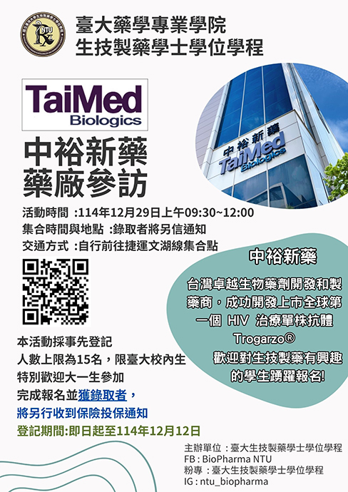 宣傳了這麼久,終於要帶大家走進真正的製藥公司研發部門!您是否曾好奇,一顆藥物是如何從研發到誕生?今年底,我們特別邀請合作夥伴-中裕新藥,開放學生實地參訪,近距離探索製藥的奧秘。